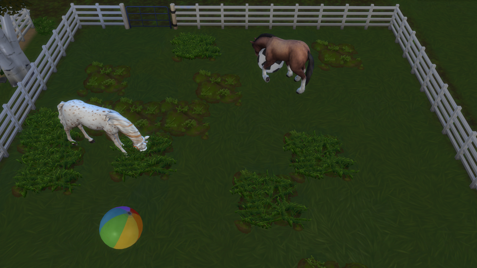 Pony and an unnamed horse, grazing and playing together, in a random paddock nearby.